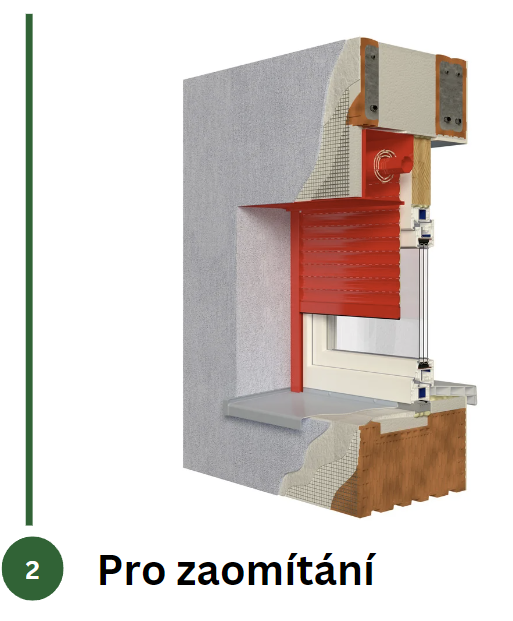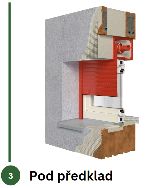 Tato instalace je ideální pro novostavby a rekonstrukce. Roletový box se zaomítá pod omítku a je třeba s ním počítat již při plánování stavby. Montáž není složitá, ačkoliv box je umístěn ve zdi nad okenním otvorem. Revizní klapka v dolní části boxu usnadňuje případné opravy bez poškození fasády.